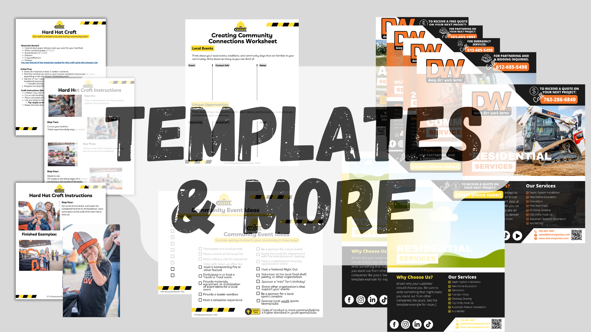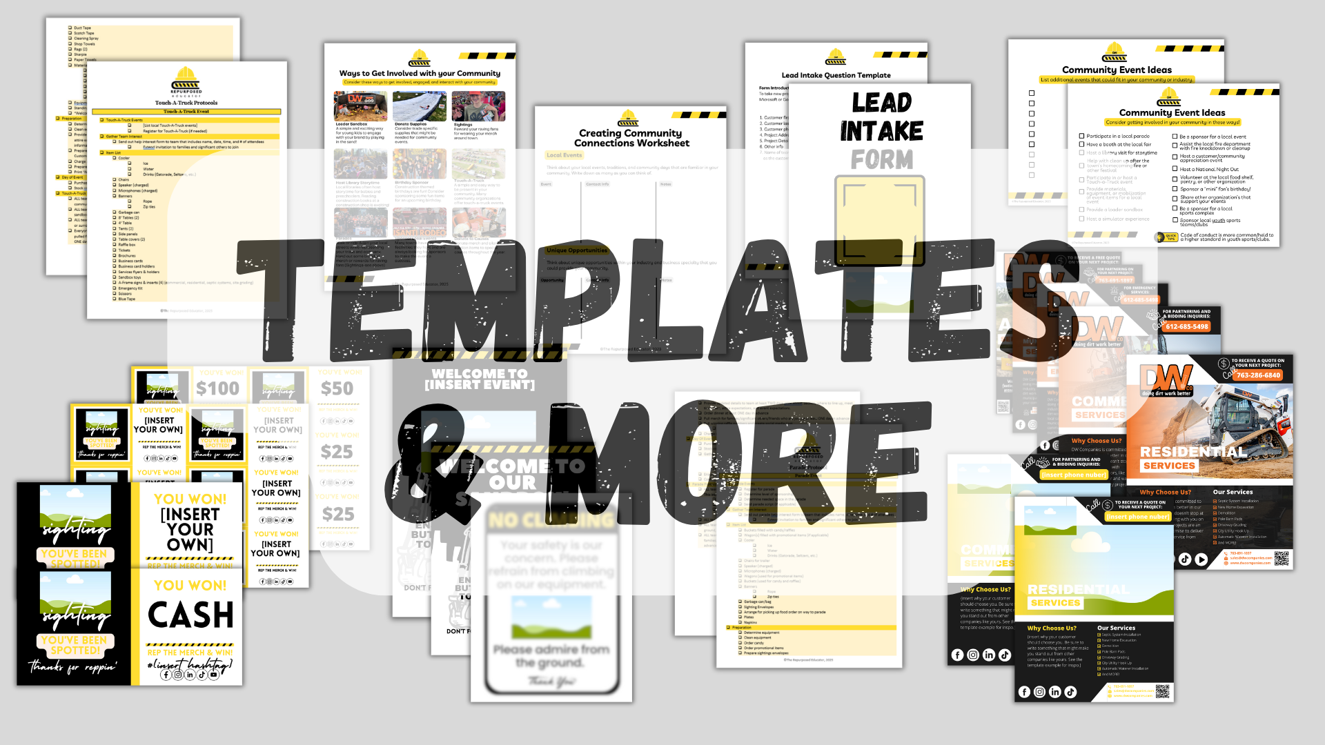 Includes: • Service Flyer Template • Service Flyer Examples • Equipment Safety Sign Template • Creating Community Connections Worksheet • Community Event Ideas Worksheets • Ways to Get Involved with you Community • Company Sighting Coupon Template • Lead Intake Form Questions & Sign Template • Parade Protocol Template • Touch-A-Truck Protocol Template • Loader Sandbox Signs Template Pillar: Community Impact
