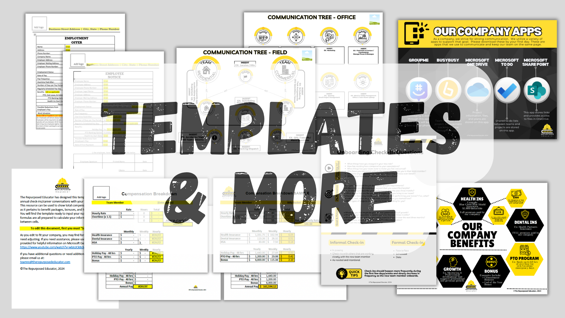Includes: • Pay Transparency Template • Employee Benefits Overview Template • Employment Offer Template • Employee Notice Template • Company Apps Template • Communication Tree Template • Onboarding Check-In Questions Pillar: Team Building